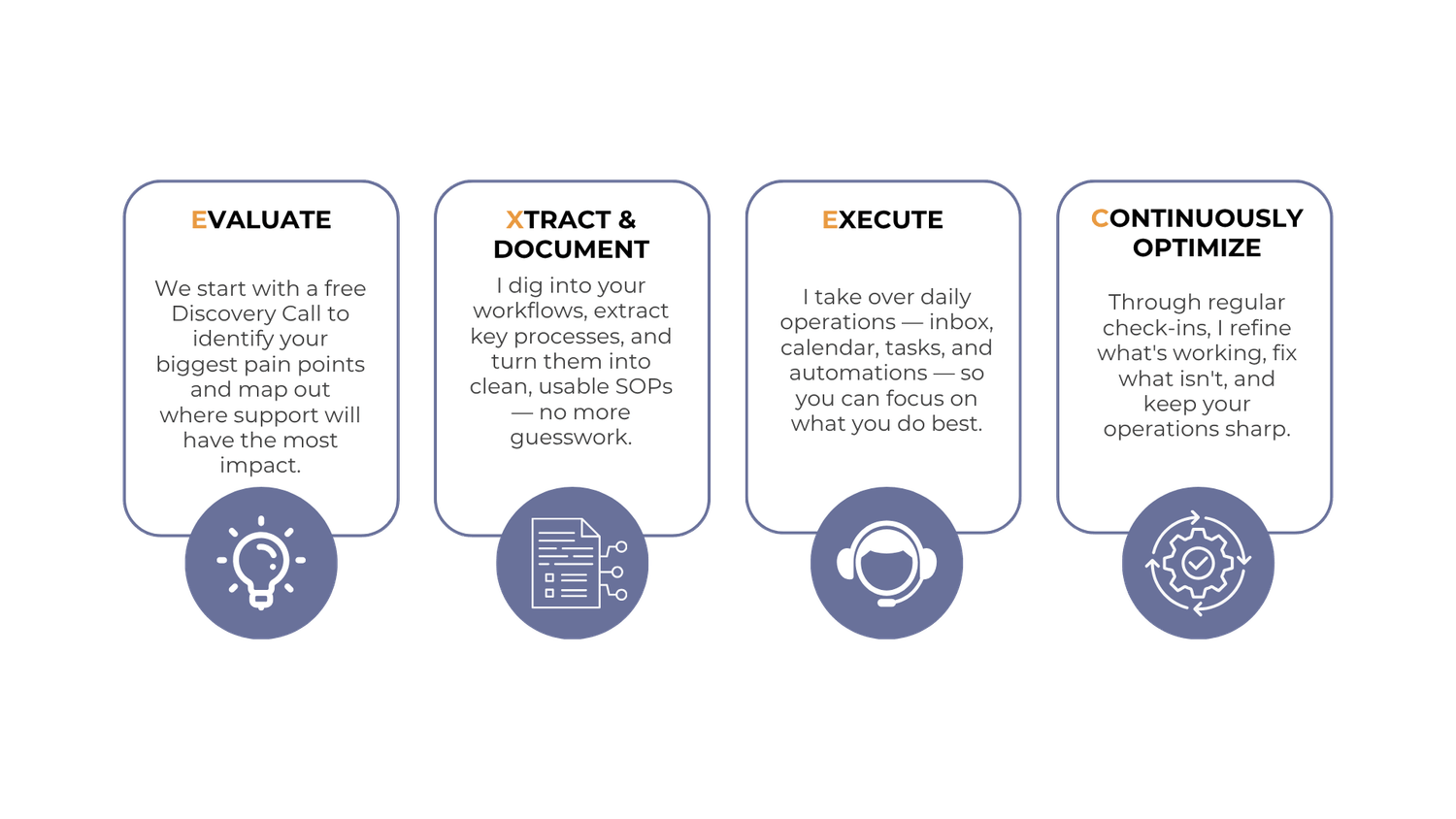The EXEC Framework is my proven process for delivering proactive, seamless support — from our very first conversation to long-term operational partnership. Designed to get you results fast, with minimal back-and-forth.